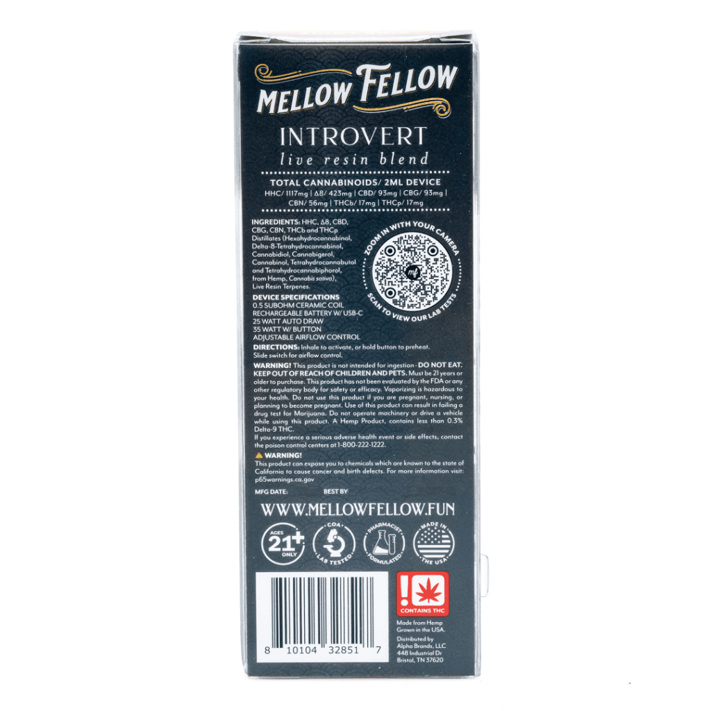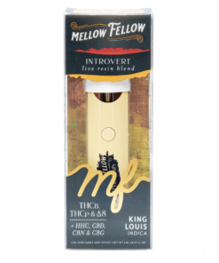 Mellow Fellow captures the zesty, piney flavor of the King Louis strain by utilizing live resin terpenes and pharmacist-blended cannabinoids. THCB, THCP, HHC, Delta 8, CBD, CBN, and CBG are mixed with this skunky flavor profile in an attempt to calm the body and broaden the mind. It has been said that King Louis’s Introvert Blend Disposable Vape provides an entourage effect that is distinct and one-of-a-kind.