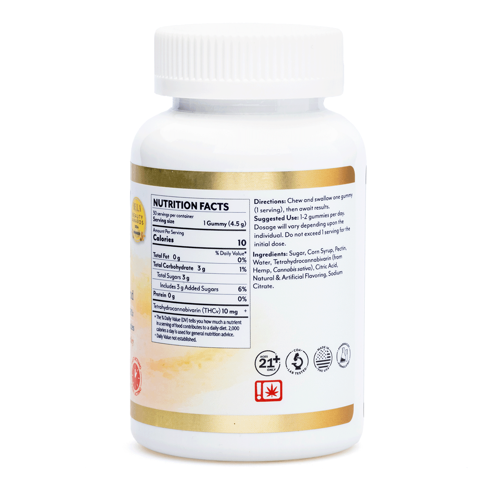 Sugar, Corn Syrup, Pectin, Water, Tetrahydrocannabivarin (from Hemp, Cannabis sativa), Citric Acid, Natural and Artificial Flavoring, Sodium Citrate.