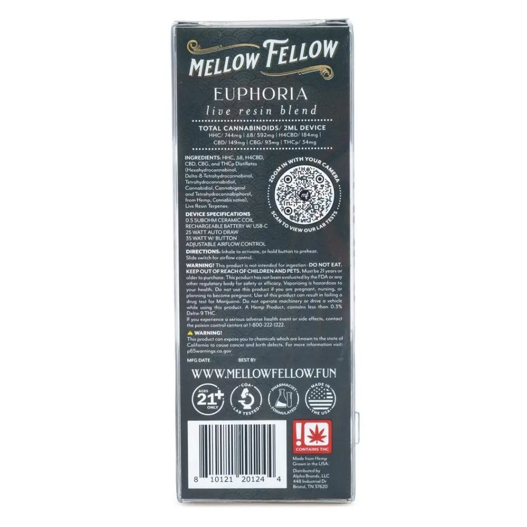This pharmacist-formulated blend of premium cannabinoids that boost and relax is a result of Mellow Fellow’s commitment to excellence. Together, THCP, HHC, Delta 8, H4CBD, CBD, and CBG create an entourage effect that is a unique form of deep relaxation.