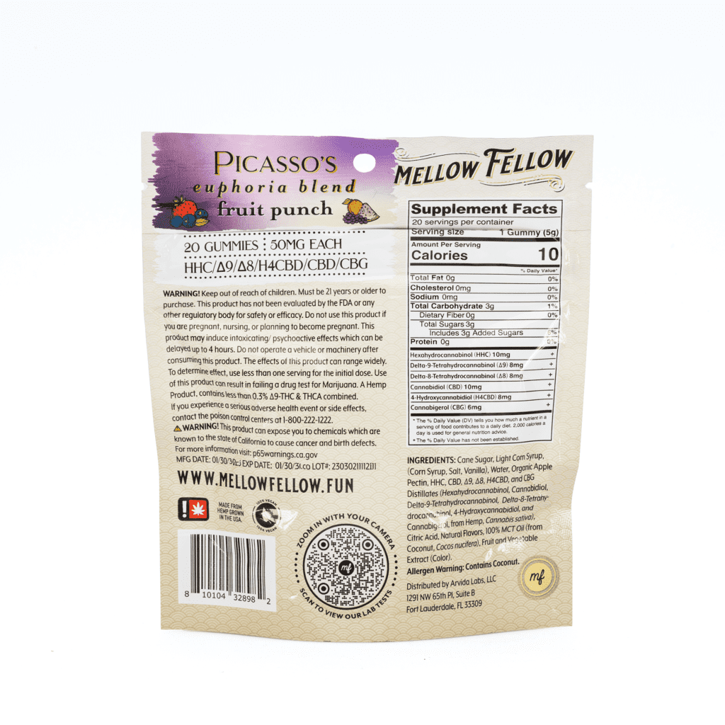 Mellow Fellow Picasso’s Euphoria Blend M-Fusion Gummies – Fruit Punch (1000 mg Total Cannabinoids)